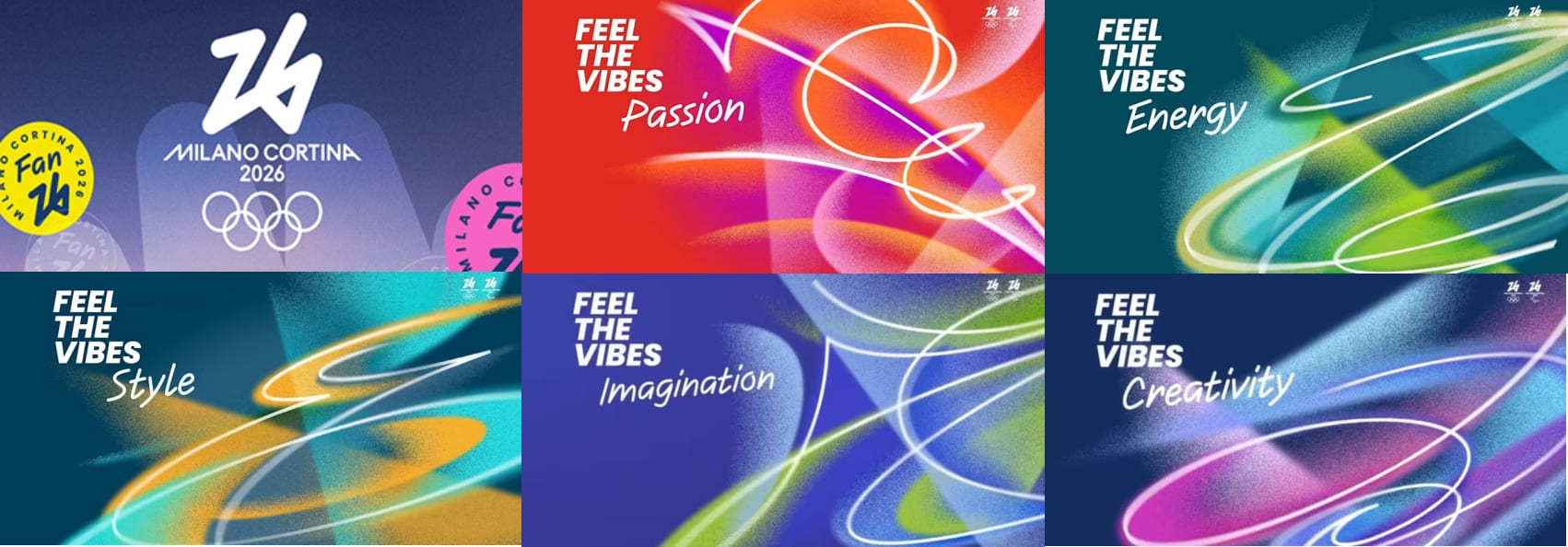 Kot vodja blagovne znamke iger Milano Cortina 2026 se vrača Raffaella Paniè, ki je vodila tudi vizualno identiteto olimpijskih iger v Torinu leta 2006. Identiteta »Vibes« črpa navdih iz italijanskih avantgardnih tradicij v umetnosti in arhitekturi ter odraža ikonična dela, znana po prevajanju abstraktnih idej v vizualno obliko. Grafični elementi utelešajo pet ključnih vrednot: energijo, ustvarjalnost, slog, domišljijo in strast. Ta vizualna identiteta zajema vsa vizualna sredstva, vključno s tekmovalnimi prizorišči, kulisami, uniformami, logotipi, maskotami, tipografijo in piktogrami.